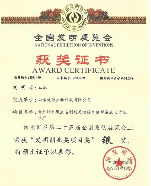 會議期間舉行全國發明展覽會“發明創業獎項目獎”頒獎典禮,山東健源生物科技有限公司申報的“青貯飼料微生態制劑關鍵技術創新集成與示范推廣”項目,受到專家評委的肯定,在眾多發明中脫穎而出,榮獲“發明創業獎項目獎”銀獎。