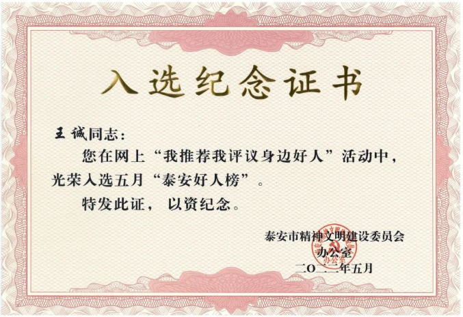 一、王誠董事長光榮入選五月“泰安好人榜”——由泰安市精神文明建設委員會頒發