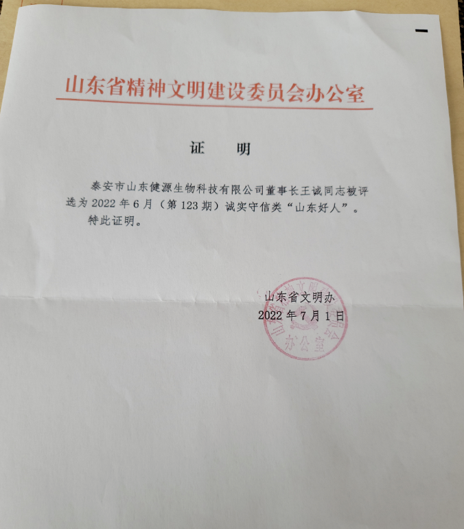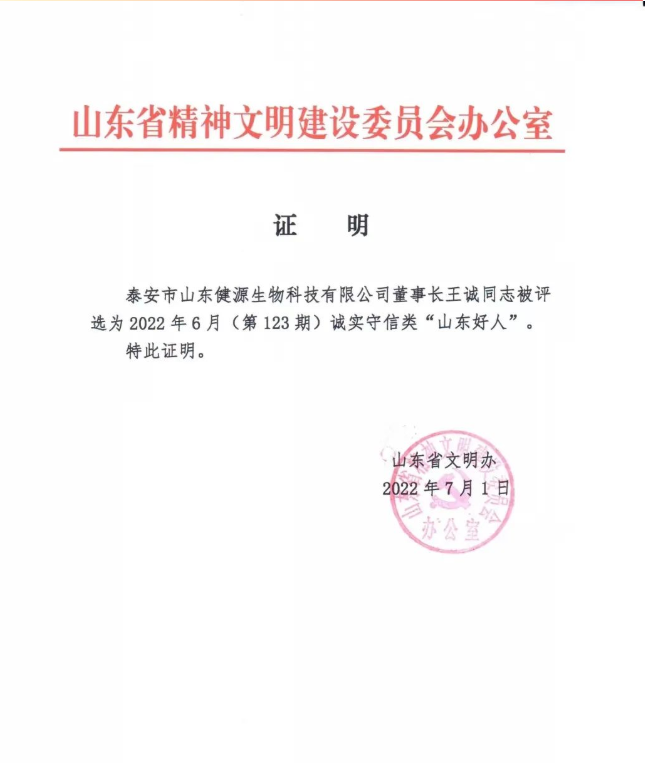 為深入貫徹落實黨的十七屆六中全會精神,推動學雷鋒活動常態化,推進公民思想道德建設,公民道德素質和社會文明程度,努力建設“美德山東”,根據省委辦公廳《關于深入開展學雷鋒活動的實施意見》(魯辦發[2012]6號)精神,在全省廣泛開展“山東好人——每周之星”評選活活動由省委宣傳部、省文明辦、大眾報業集團、省總工會、團省委、省婦聯、山東廣播電視臺聯合主辦。山東健源生物科技有限公司王誠董事長被評選為2022年6月(123期)誠實守信類“山東好人”。