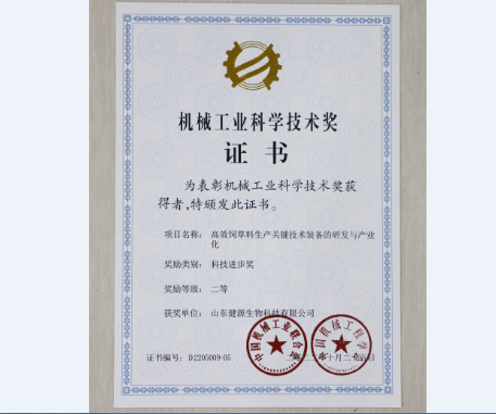 10月20日,中國機械工業聯合會、中國機械工程學會發布了《關于表彰2022年度“機械工業科學技術獎”獎勵項目的通報》文件,山東健源生物科技有限公司參與完成的《高效飼草料生產關鍵技術裝備的研發與產業化》項目榮獲2022年度機械工業科學技術獎“科技進步獎二等獎”。
