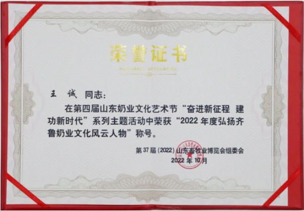 山東健源生物董事長王誠榮獲“2022年度弘揚齊魯奶業文化風云人物”稱號