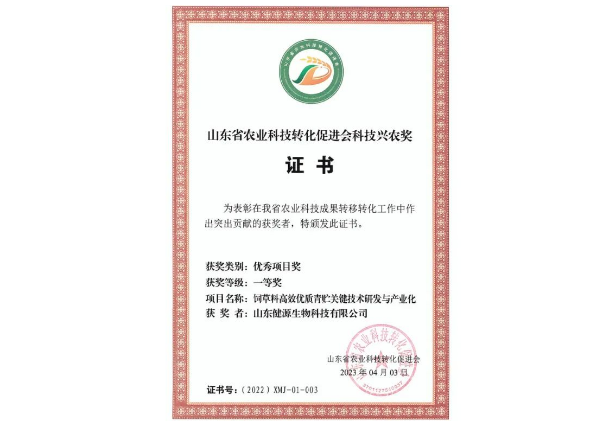 山東健源生物榮獲山東省農(nóng)業(yè)科技轉(zhuǎn)化促進(jìn)會(huì)科技興農(nóng)獎(jiǎng)一等獎(jiǎng)