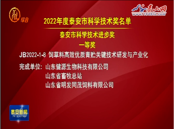 會議宣讀了泰安市人民政府《關于2022年度科學技術獎勵的決定》和《關于下達2023年泰安市科技創新“雙十工程”項目的通知》,并為2022年度科學技術獎獲獎代表頒獎。山東健源生物科技有限公司《飼草料高效優質青貯關鍵技術研發與產業化》項目榮獲泰安市科學技術進步獎一等獎。