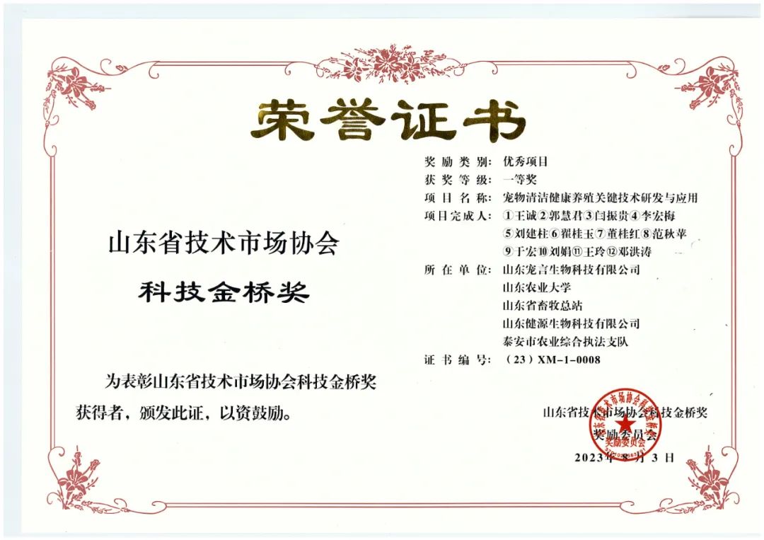 9月14日,2023年度山東省科技金橋獎表彰獎勵大會暨科技引領高質量發展會議在濟寧任城區召開。山東健源生物有限公司與其下屬山東寵言生物科技有限公司共同完成的“寵物清潔健康養殖關鍵技術研發與應用”項目,經過專業組評審、評審委員會評審、獎勵委員會終審,最終榮獲山東省技術市場協會科技金橋獎優秀項目一等獎。