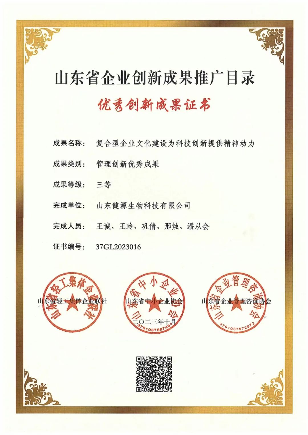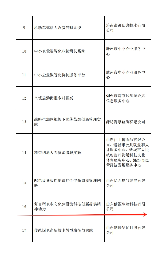 近日,山東省輕工集體企業聯社公布了《2023年企業創新優秀成果推廣目錄名單》。山東健源生物科技有限公司的“復合型企業文化建設為科技創新提供精神動力”榮獲管理創新優秀成果證書,并成功入選了山東省企業創新成果推廣目錄。