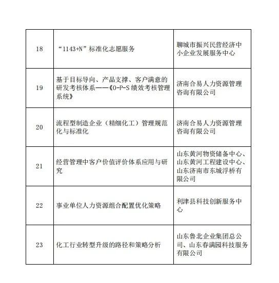 為深入貫徹黨的二十大精神,落實《工業和信息化部辦公廳關于開展數字化賦能、科技成果賦智、質量標準品牌賦值中小企業全國行活動的通知》(工信廳企業函〔2023〕171號)要求,鼓勵、支持、引導廣大中小企業加大科研投入,增強創新能力,提高科技成果轉化和產業化水平,推動科技成果有效“賦智”中小企業,持續增強核心競爭力,組織開展了2023年企業創新優秀成果推廣目錄申報工作。經企業自愿申報、各市中小企業主管部門和服務機構初審推薦、專家評審認定, 公示和異議復核等程序,確定將23項管理創新成果項目認定為創新優秀成果、新產品和論文,統一納入企業創新優秀成果推廣目錄。