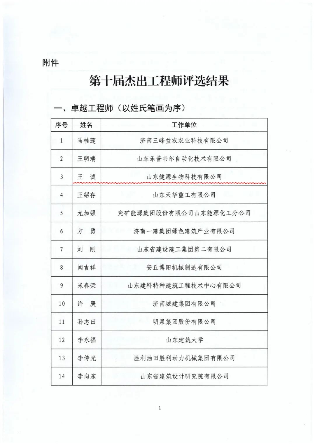 發布時間:[2023-12-20 8:8:46] 瀏覽量:3215次日前,由山東省工程師協會、山東人才發展集團聯合舉辦的第十屆杰出工程師評選結果揭曉,山東健源生物科技有限公司董事長王誠榮獲“卓越工程師”稱 號。