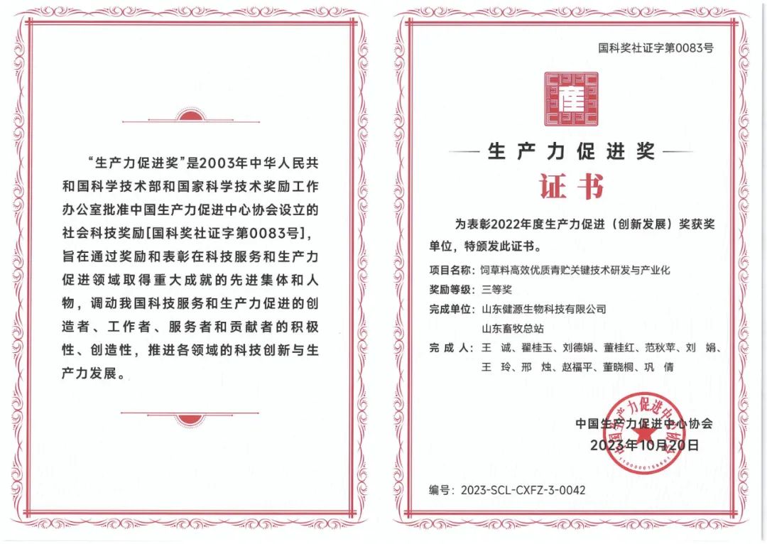 12月9日,2023中國生產(chǎn)力促進(jìn)中心協(xié)會年會暨第十六屆寰宇生產(chǎn)力論壇生產(chǎn)力創(chuàng)新發(fā)展大會在北京成功召開,山東健源生物科技有限公司“飼草料高效優(yōu)質(zhì)青貯關(guān)鍵技術(shù)研發(fā)與產(chǎn)業(yè)化”項目榮獲2022年度生產(chǎn)力促進(jìn)(創(chuàng)新發(fā)展)獎三等獎。