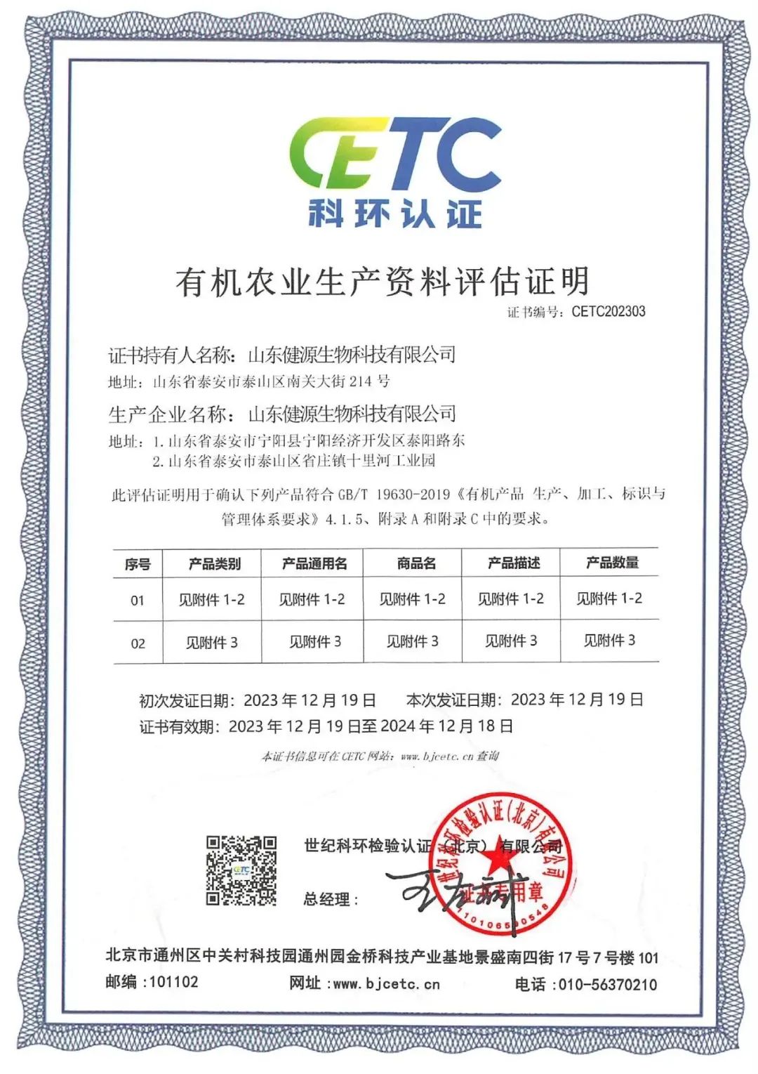 健源生物高活性生物系列產(chǎn)品通過“有機農(nóng)業(yè)生產(chǎn)資料評估證明”認(rèn)證