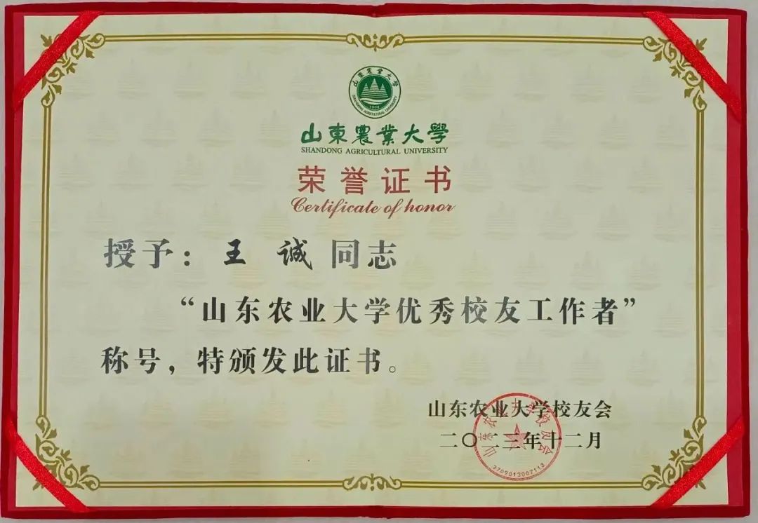 作為山東農業大學的一名校友,健源生物董事長王誠飲水不忘思源,積極參與到泰安聯絡處換屆工作中,擔任換屆工作籌備組秘書長,本著隆重熱烈、務實節儉的原則,經過明確分工、周密部署、精誠協作,被山東農業大學校友會聘請為山東農業大學校友會泰安聯絡處秘書長并授予“山東農業大學優秀校友工作者”榮譽稱號。