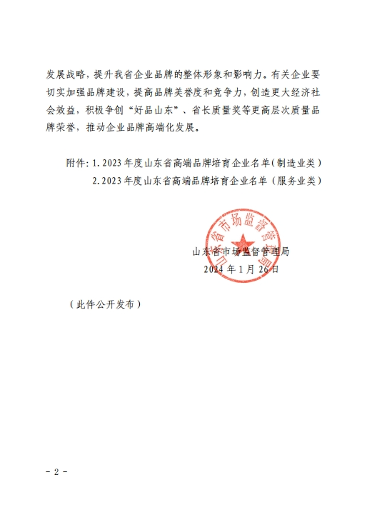 發布時間:[2024-2-4 8:44:32] 瀏覽量:3224次山東省市場監督管理局主持開展的山東省高端品牌培育企業評選工作是培育質量高、效益高、誠信度高、美譽度高的山東企業品牌,是深入實施質量強省及品牌戰略,共建共享“好品山東”,加快推進山東省品牌高端化進程的一項重要工作。經組織申報、資格審查、專家評審、綜合評價、結果審定等環節,共有360家企業(含制造業300家、服務業60家)入選2023年度山東省高端品牌培育企業。