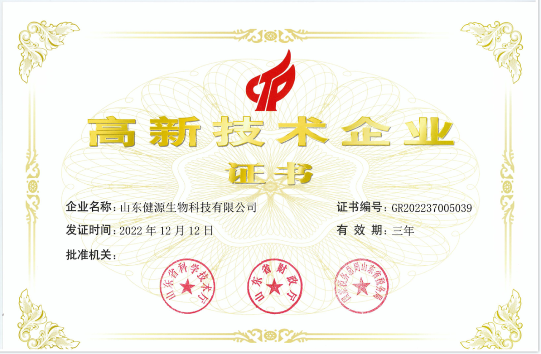 2022年12月,山東健源生物科技有限公司再次通過2022年度國家高新技術企業認定,有效期三年。