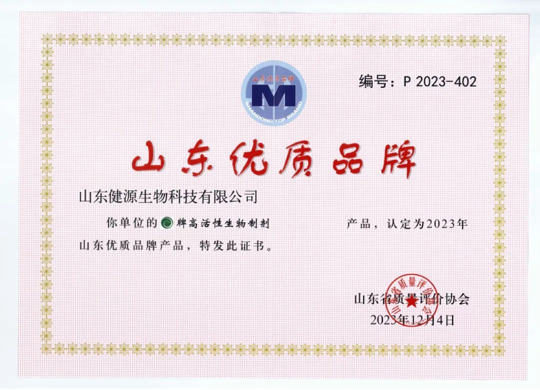 2023年12月,健源高活性生物制劑被山東省質量評價協會認定為2023年山東優質品牌產品。