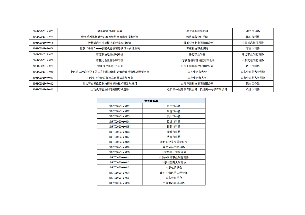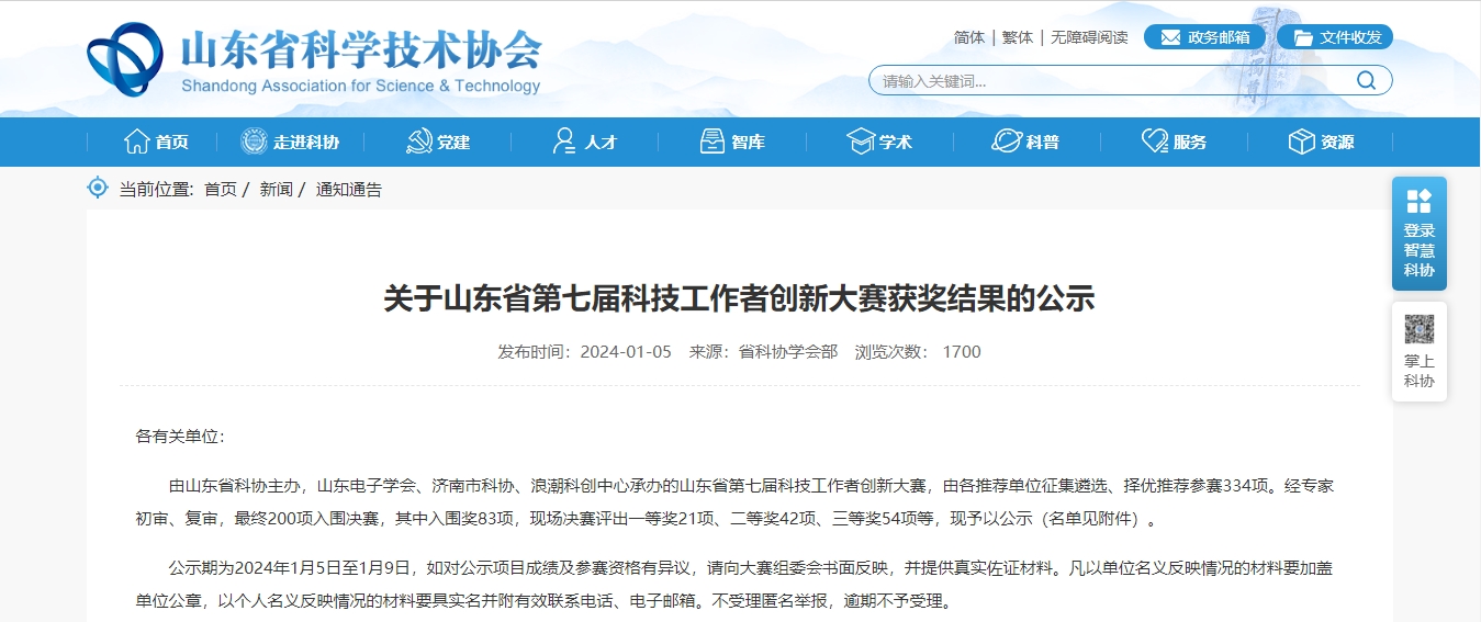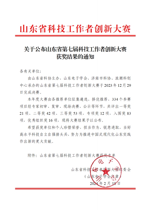 由山東省科協主辦,山東電子學會、濟南市科協、浪潮科創中心承辦的山東省第七屆科技工作者創新大賽于2023年12月29日完成決賽。本年度大賽由各市科協、省級學會、高校科協、院士工作站等征集遴選、擇優推薦的334項參賽項目,經專家初審、復審、現場決賽、公示等環節,共評出一等獎21項,二等獎42項,三等獎53項,專項獎12項,入圍獎83項,優秀組織獎16項。