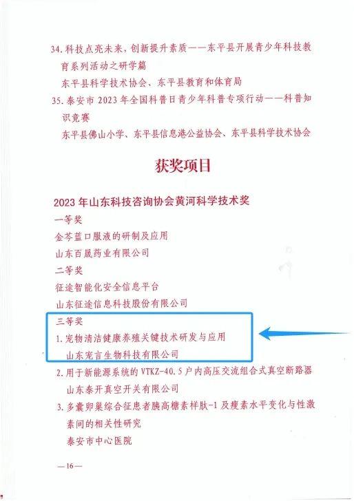 寵言生物榮獲2023年山東科技咨詢協會黃河科學技術獎三等獎