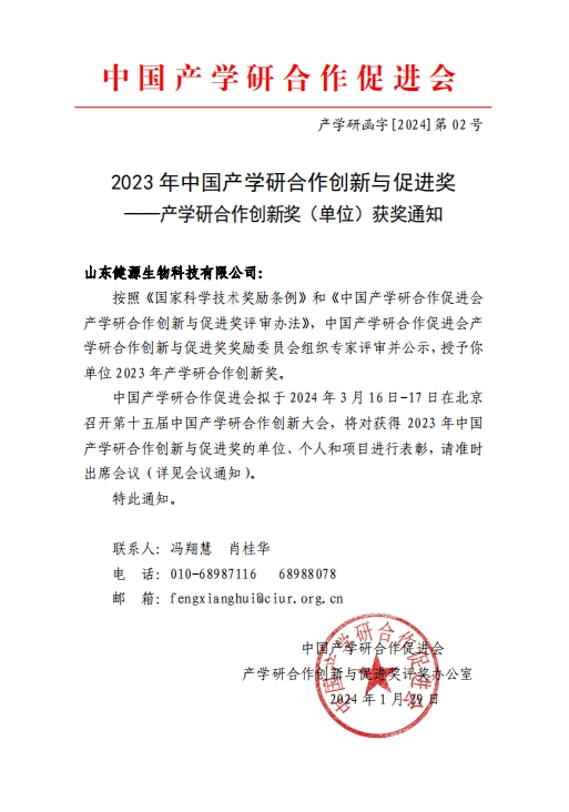 大會表彰了2023年在產學研協同創新工作中做出突出貢獻的單位和個人。山東健源生物科技有限公司被中國產學研合作促進會授予2023年中國產學研合作創新獎。