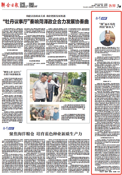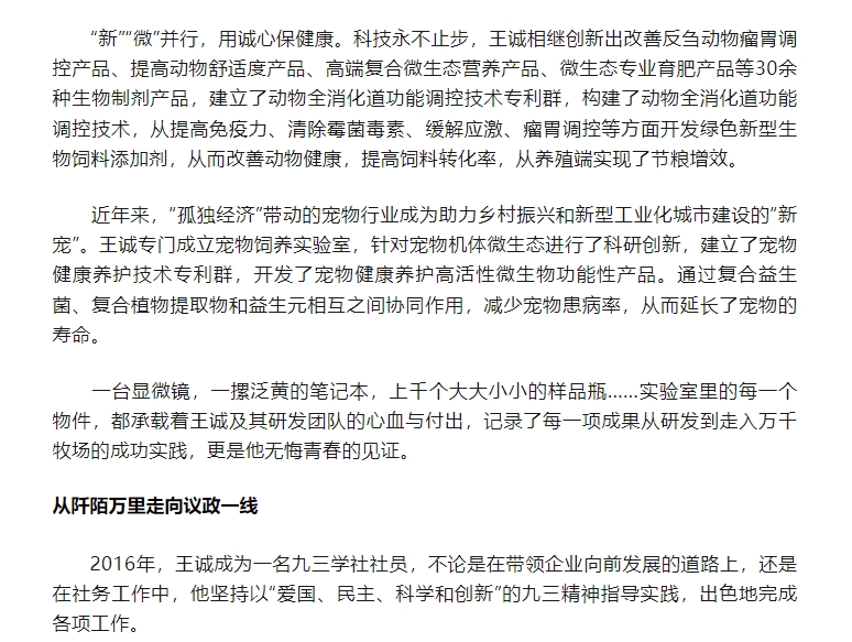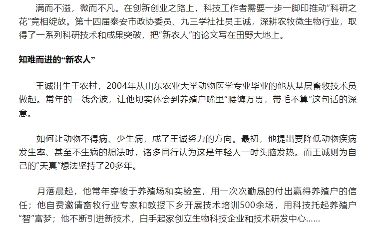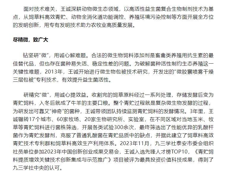 日前,王誠董事長接受了聯合日報記者的采訪,報道發表在2024年6月20日《聯合日報》3版,講述了王誠董事長作為“新農人”,20多年來深耕微生態領域,以高活性益生菌符合生物制劑技術為基點,從飼草料高效青貯、動物全消化道功能調控、養殖環境污染控制等方面開展全方位的發明創新,用專有發明技術助力農牧業高質量發展。而作為一名九三學社社員,王誠董事長堅持以“愛國、民主、科學和創新”的九三精神指導實踐,出色地完成各項工作。該報道同時被九三學社山東省委員會轉載報道。