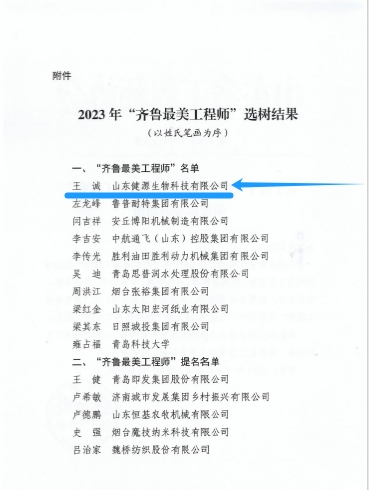 發布時間:[2024-7-5 15:51:56] 瀏覽量:2807次近日,山東省工程師協會下發關于授予2023年度“齊魯最美工程師”榮譽稱號的通報,山東健源生物科技有限公司董事長王誠被授予2023年度“齊魯最美工程師”榮譽稱號。