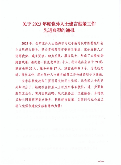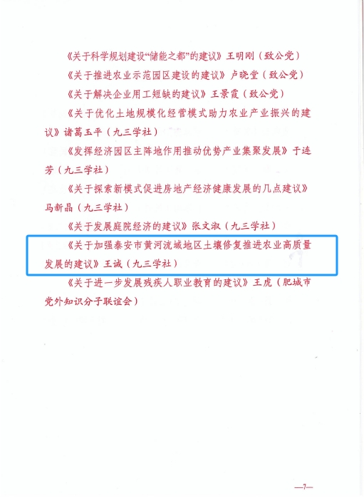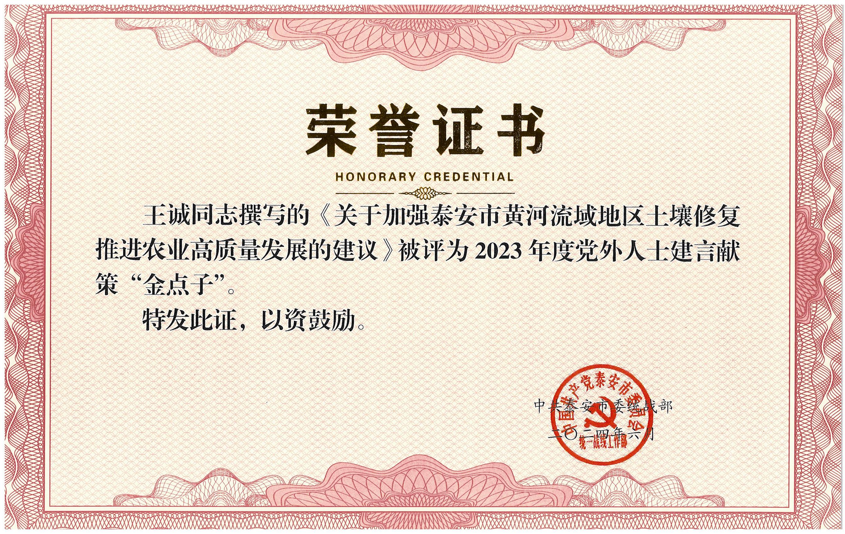 發布時間:[2024-7-9 17:52:5] 瀏覽量:3162次會上公布了《關于2023年度黨外人士建言獻策工作先進典型的通報》,王誠董事長被評為2023年度黨外人士建言獻策“建言先鋒”,撰寫的《關于加強泰安市黃河流域地區土壤修復推進農業高質量發展的建議》被評為2023年度黨外人士建言獻策“金點子”。