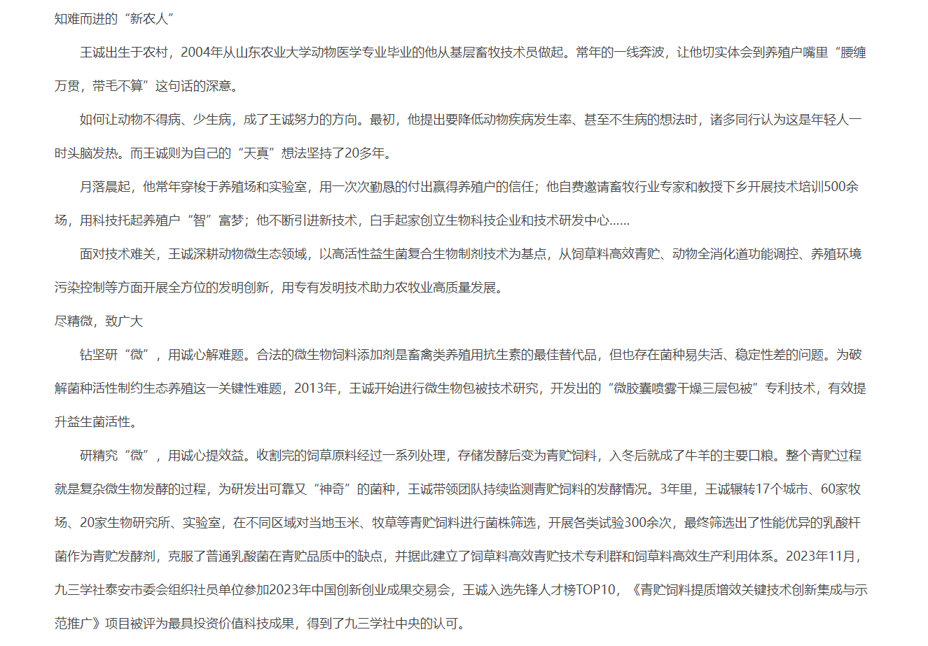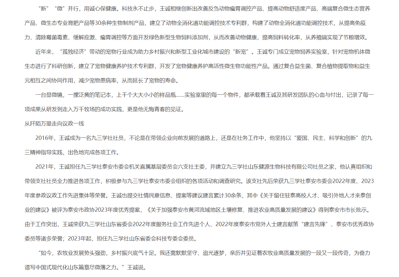 發(fā)布時(shí)間:[2024-8-7 15:16:1] 瀏覽量:3131次近日,中國(guó)人民政治協(xié)商會(huì)議山東省委員會(huì)官網(wǎng)推送《“微”而不凡的 科技“新農(nóng)人”》文章,報(bào)道山東健源生物科技有限公司董事長(zhǎng)王誠(chéng)作為“新農(nóng)人”,20多年來深耕微生態(tài)領(lǐng)域,以高活動(dòng)性益生菌復(fù)合生物制劑技術(shù)為基點(diǎn),從飼草料高效青貯、動(dòng)物全消化道功能調(diào)控、養(yǎng)殖環(huán)境污染控制等方面全方位的發(fā)明創(chuàng)新,用專有發(fā)明技術(shù)助力農(nóng)牧業(yè)高質(zhì)量發(fā)展。而作為一名九三學(xué)社社員,王誠(chéng)董事長(zhǎng)堅(jiān)持以“愛國(guó)、民主、科學(xué)和創(chuàng)新”的九三精神指導(dǎo)實(shí)踐,出色地完成各項(xiàng)工作。全文如下:
