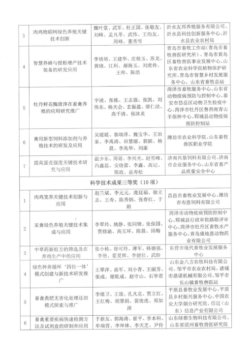 按照《山東省畜牧科學(xué)技術(shù)獎獎勵管理辦法》的規(guī)定,為表彰獎勵在我省畜牧技術(shù)科技研發(fā)和推廣中作出貢獻的單位和個人,經(jīng)過評審,評選出山東省畜牧科學(xué)技術(shù)獎技術(shù)成果獎一等獎5個,二等獎7個,三等獎10個。
