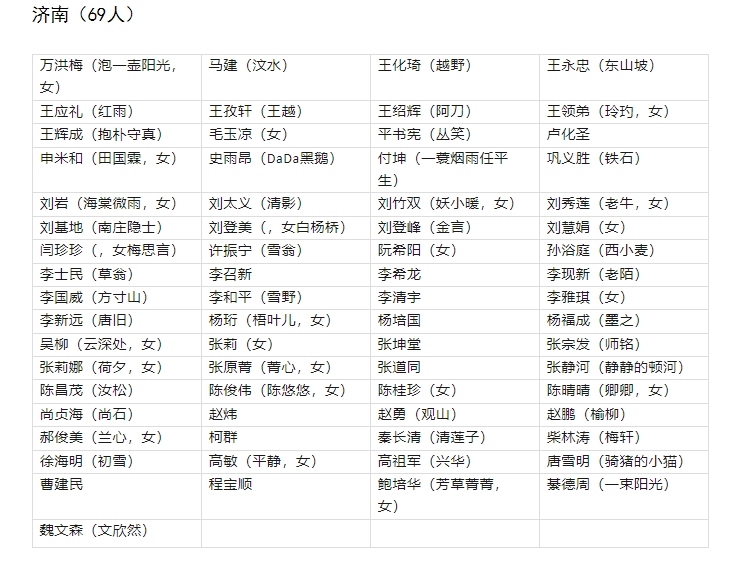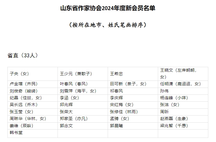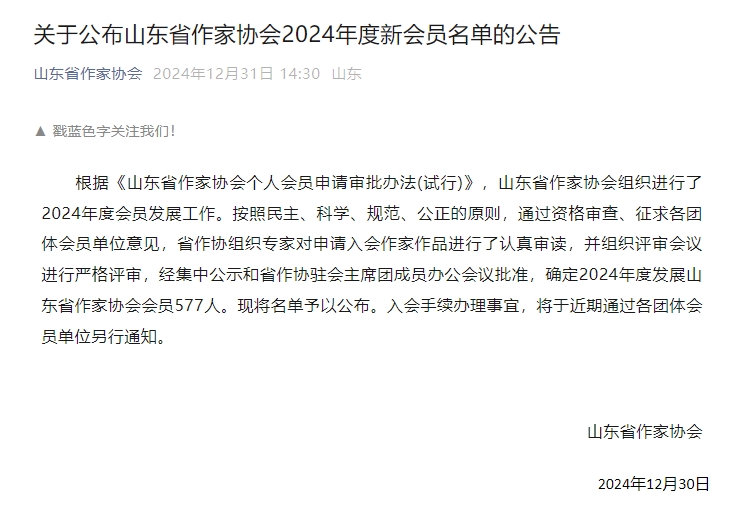 根據(jù)《山東省作家協(xié)會(huì)個(gè)人會(huì)員申請審批辦法(試行)》,山東省作家協(xié)會(huì)組織進(jìn)行了2024年度會(huì)員發(fā)展工作。按照民主、科學(xué)、規(guī)范、公正的原則,通過資格審查、征求各團(tuán)體會(huì)員單位意見,省作協(xié)組織專家對申請入會(huì)作家作品進(jìn)行了認(rèn)真審讀,并組織評審會(huì)議進(jìn)行嚴(yán)格評審,經(jīng)集中公示和省作協(xié)駐會(huì)主席團(tuán)成員辦公會(huì)議批準(zhǔn),確定2024年度發(fā)展山東省作家協(xié)會(huì)會(huì)員577人。
