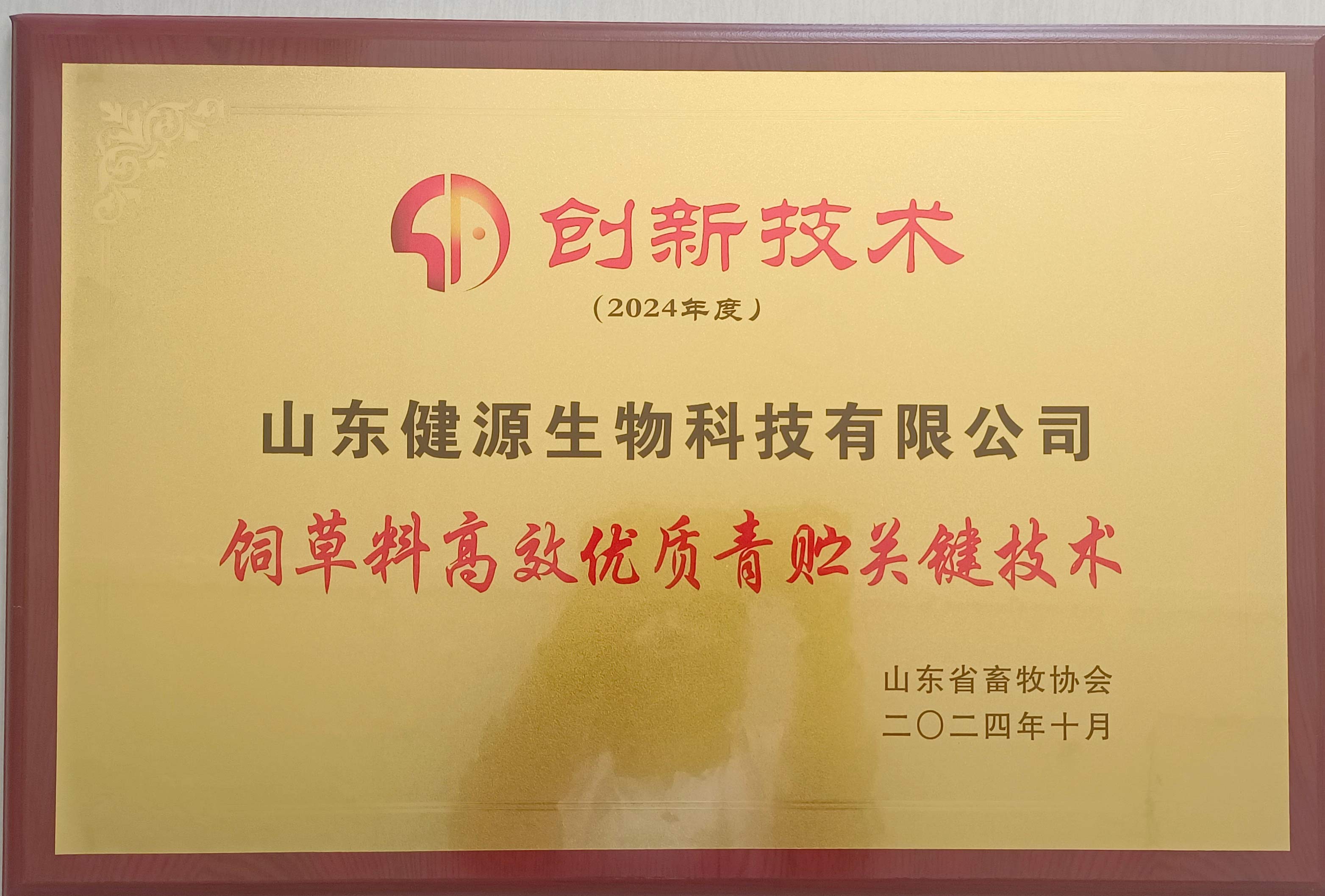 熱烈祝賀健源生物榮獲2024年度山東省畜牧協會“創新技術”獎