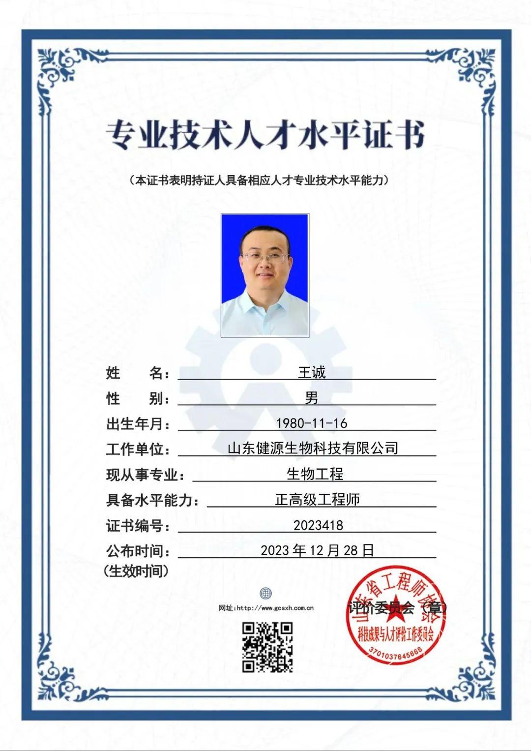 董事長王誠榮獲正高級工程師專業技術人才水平證書