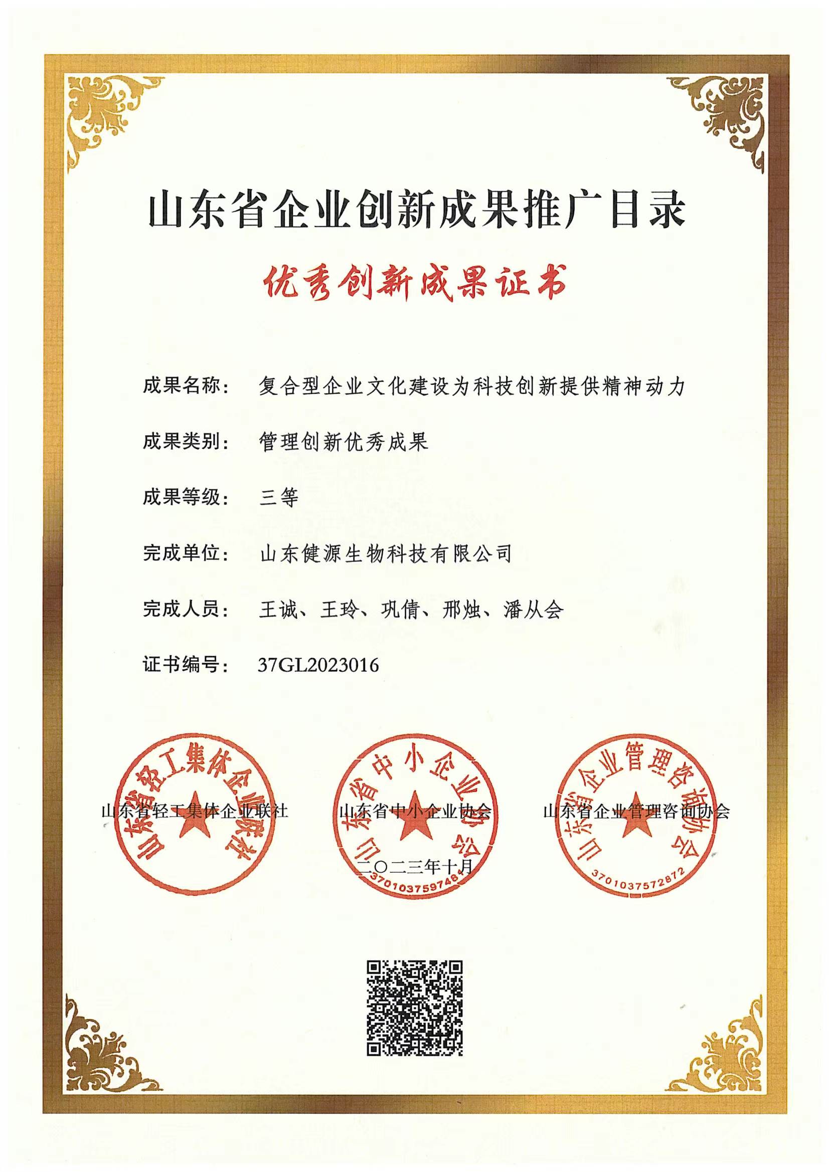 山東健源生物科技有限公司 “復合型企業文化建設為科技創新提供精神動力” 榮獲管理創新優秀成果 三等...
