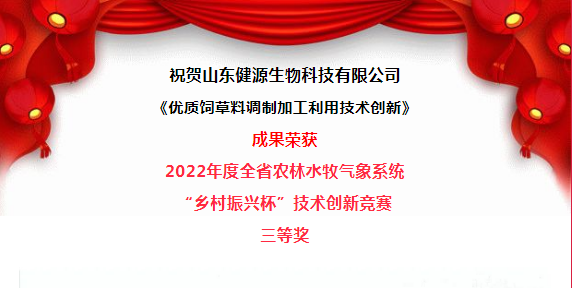 近日,由山東省總工會牽頭,山東省水利廳、山東省農業農村廳、山東省自然資源廳、山東省畜牧獸醫局、山東省氣象局組織的2022 年度全省農林水牧氣象系統 “鄉村振興杯”和“建設綠色安瀾黃河” 工作創新技術創新競賽獲獎成果進行了公布。山東健源生物科技有限公司《優質飼草料調制加工利用技術創新》成果榮獲2022年度全省農林水牧氣象系統“鄉村振興杯”技術創新競賽三等獎。