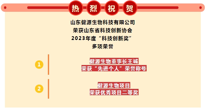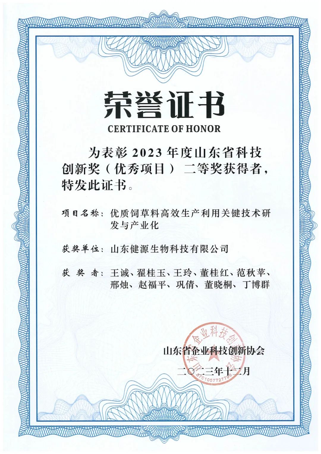近日,山東省企業(yè)科技創(chuàng)新協(xié)會公布了《關(guān)于公示2023年度科技創(chuàng)新獎(jiǎng)評審結(jié)果的決定》,山東健源生物科技有限公司董事長王誠被評為2023年度山東省科技創(chuàng)新獎(jiǎng)先進(jìn)個(gè)人,《優(yōu)質(zhì)飼草料高效生產(chǎn)利用關(guān)鍵技術(shù)研究與產(chǎn)業(yè)化》項(xiàng)目榮獲山東省科技創(chuàng)新獎(jiǎng)優(yōu)秀項(xiàng)目二等獎(jiǎng)。